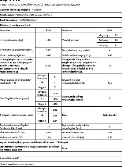 | Energiafogyasztás (mosás) | 0.39 kWh/ciklus |